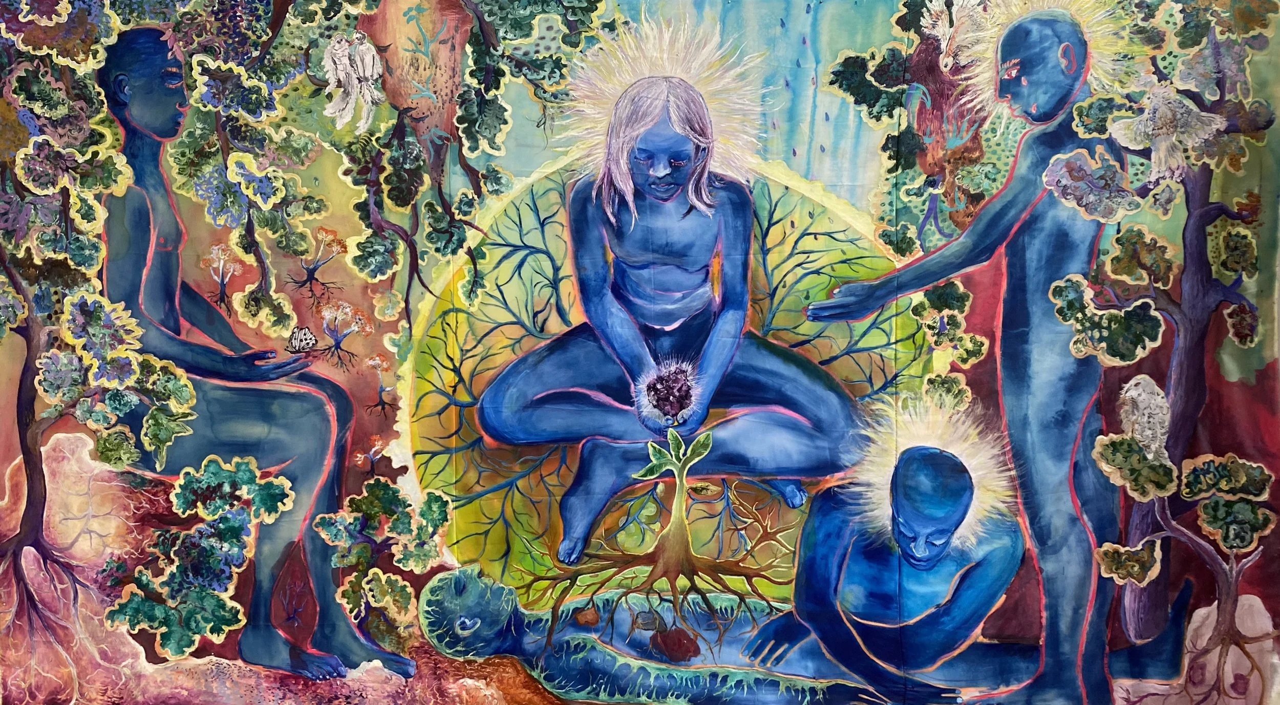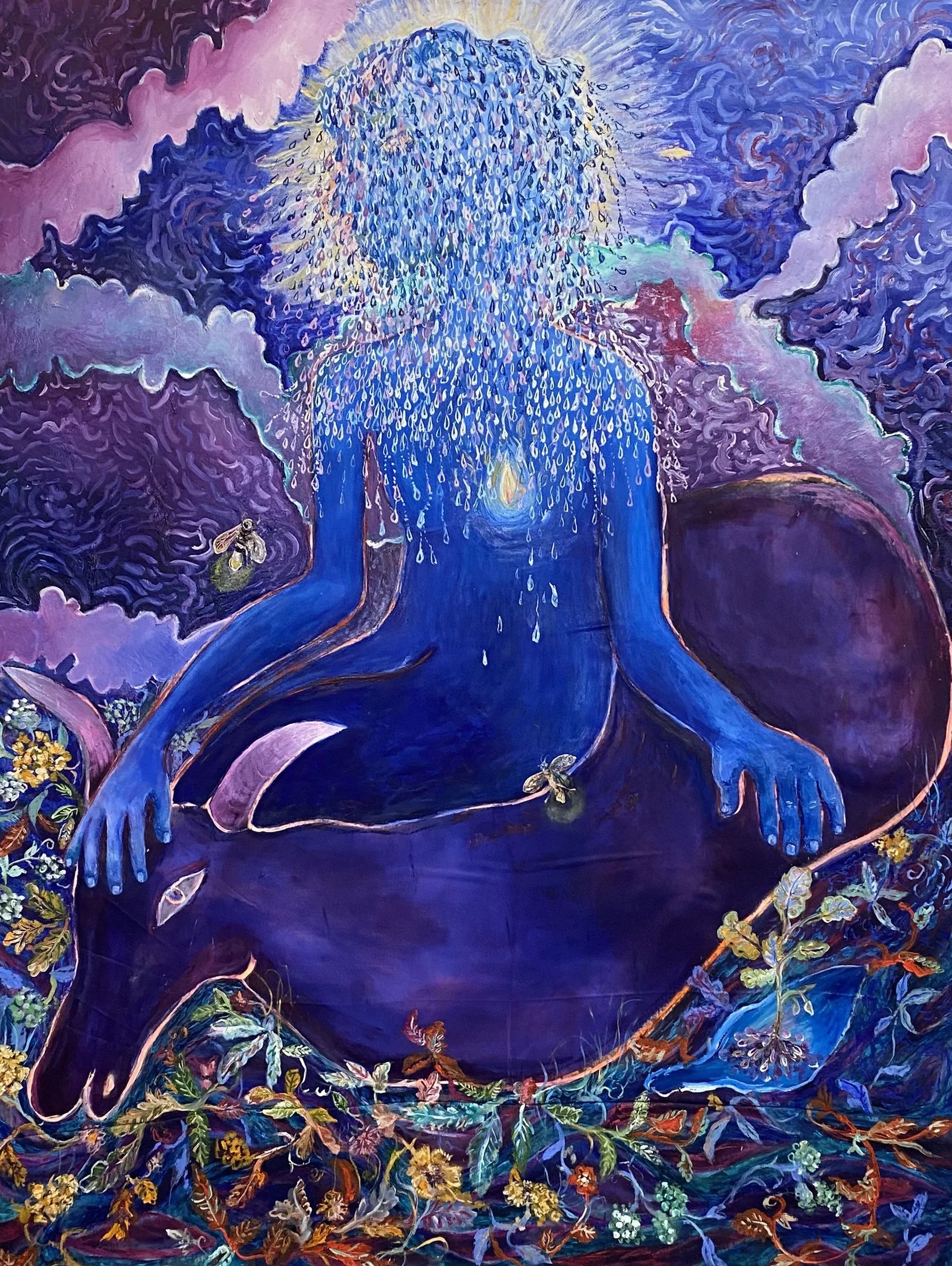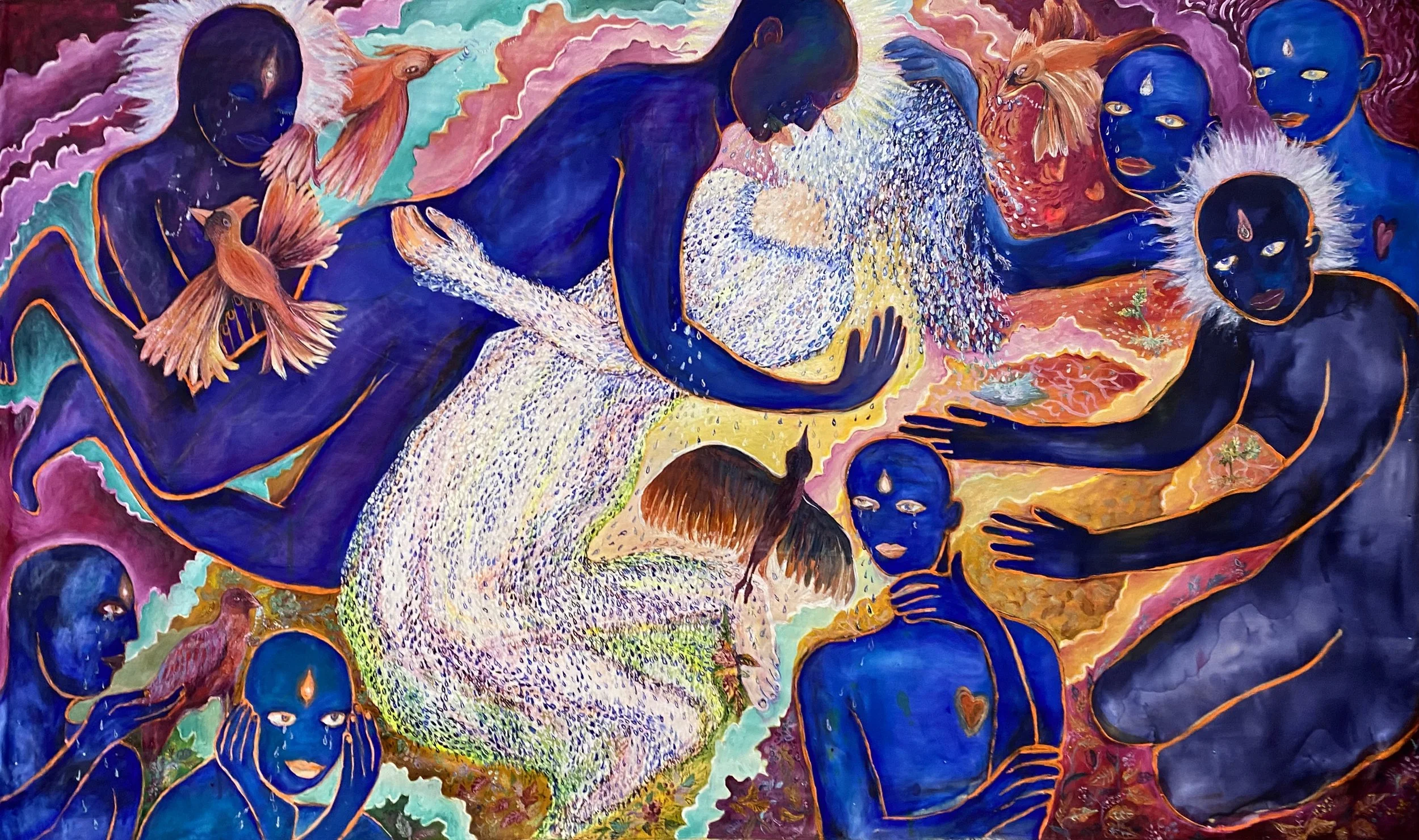 Blue Ethereals are visual portals into this journey. Each figure embodies resilience and spiritual memory, reclaiming the body as a vessel of healing and love. The blue that defines them is both sky and sacred, a universal skin that dissolves divisions of race, gender, and trauma. Blue here symbolizes eternity, spirituality, solace, and the flowing, renewing power of water. Painting these figures has become a practice of transformation, turning trauma into a source of wisdom and agency.