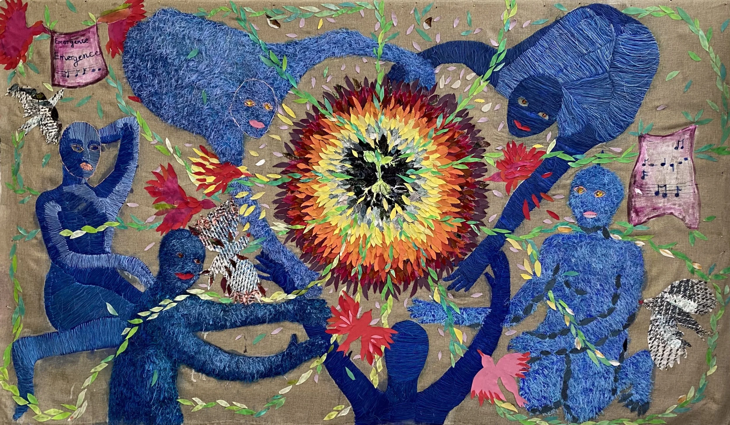 Emergence, 250x150cm, silk paint, acrylic, silk thread embroidery, fabric collage