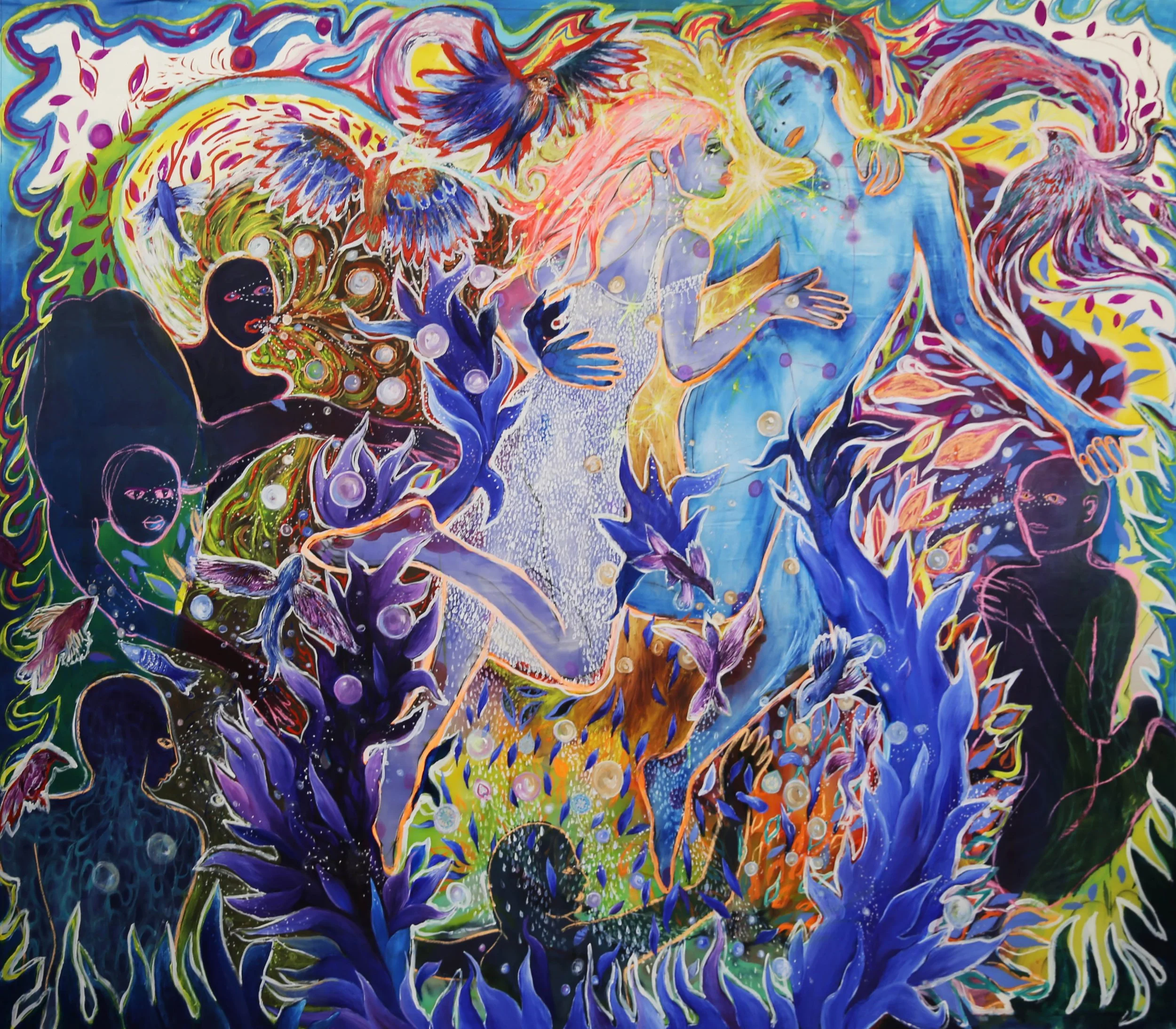 The Love That Changed the River, silk paint oil, soft pastel on silk, 208x208cm