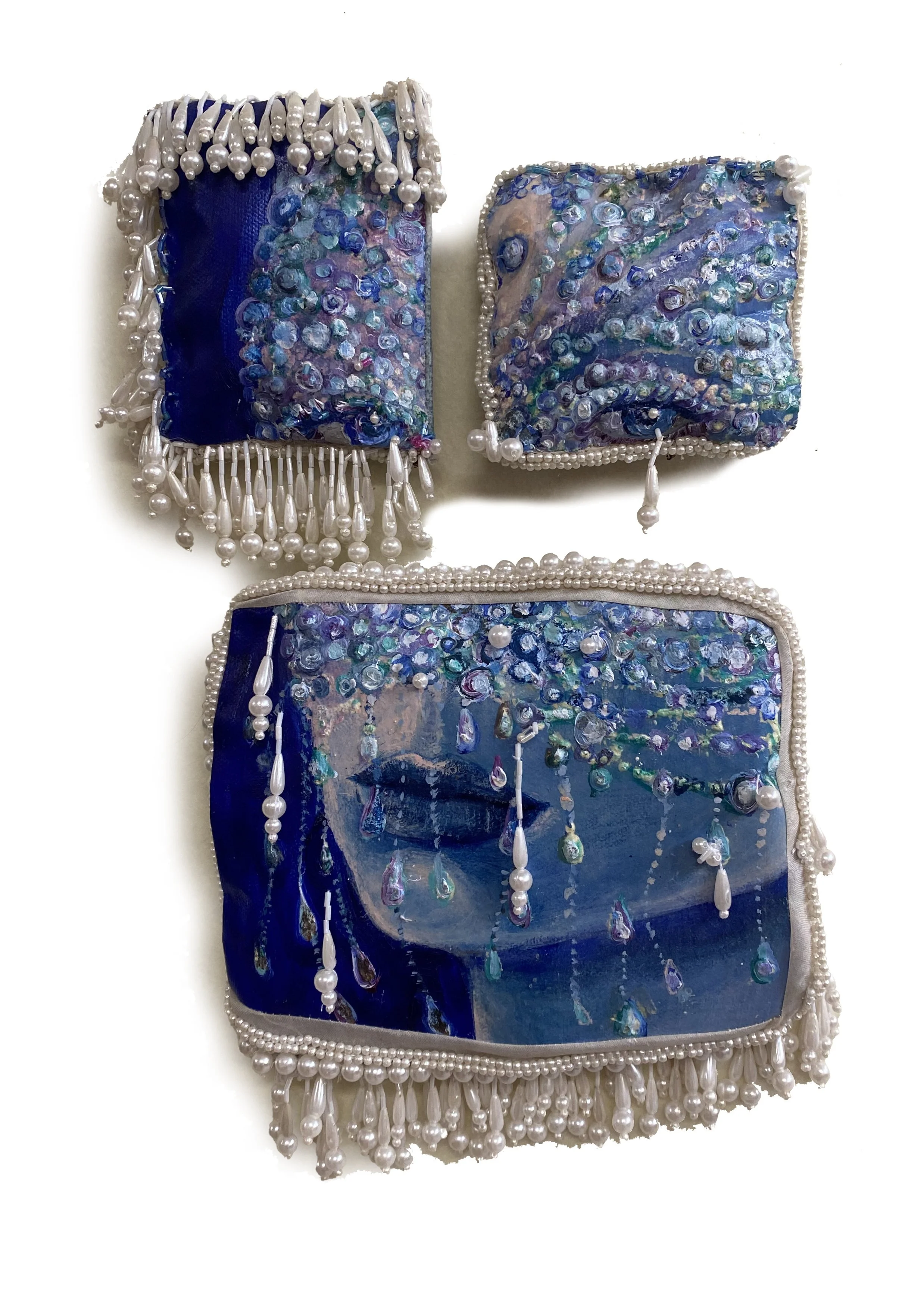 Cry in a pillow, oil, acrylic on canvas, velvet, vintage beads, 12x10cm’ 9.7x9.7cm; 19x21cm