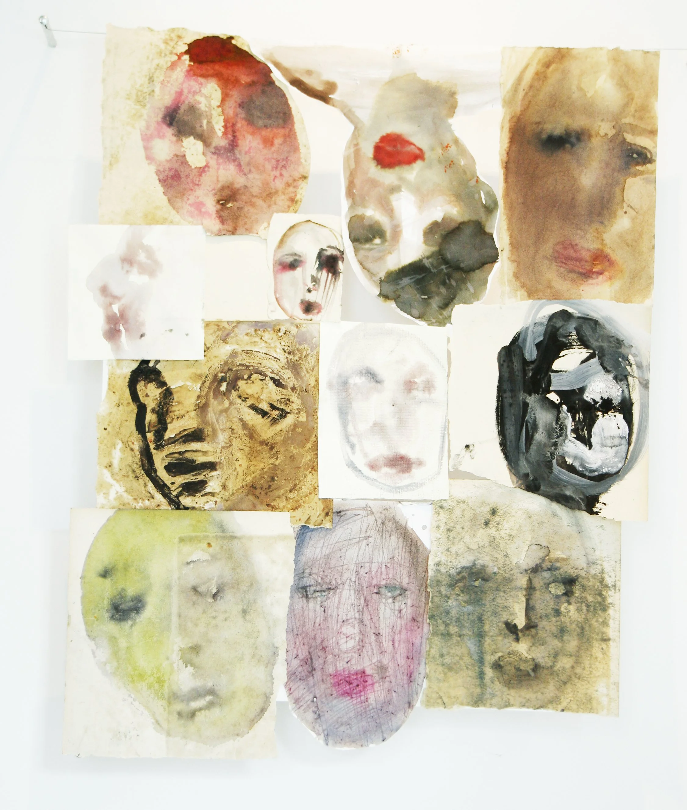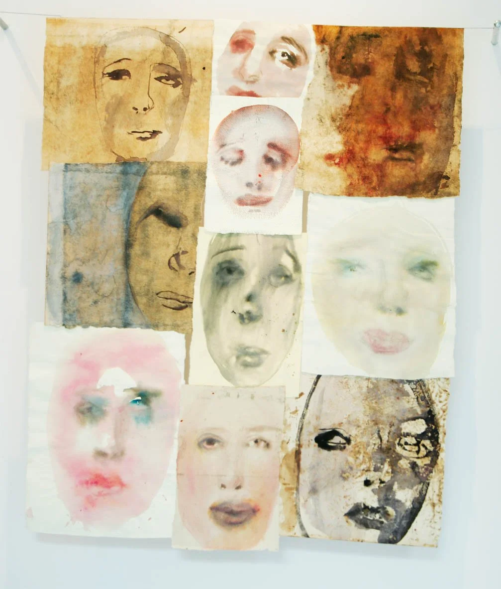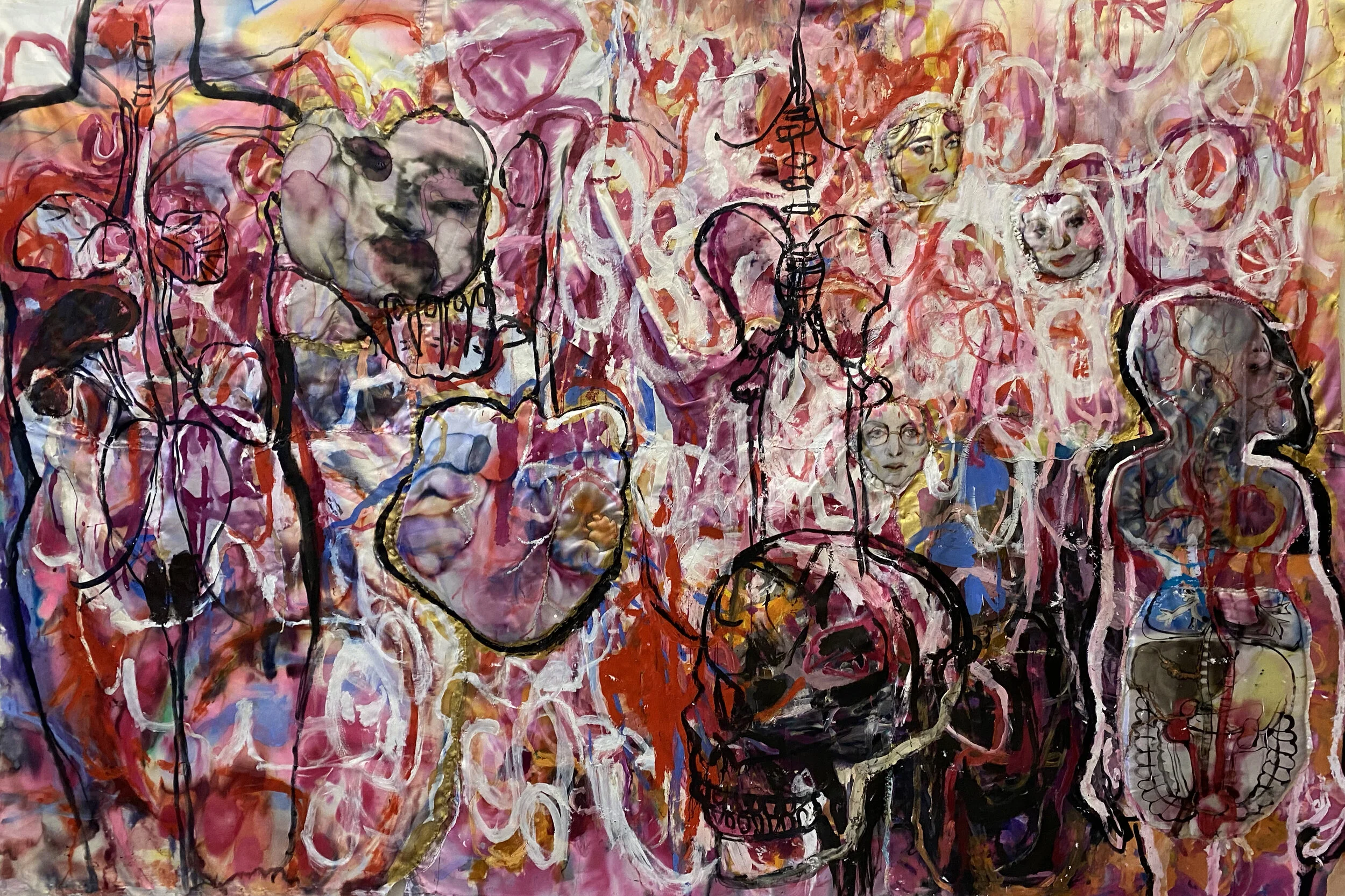 Heads No 9, oil, ink, mixed media, glue, stitching on silk fabric 300x250cm, 2016-2019
