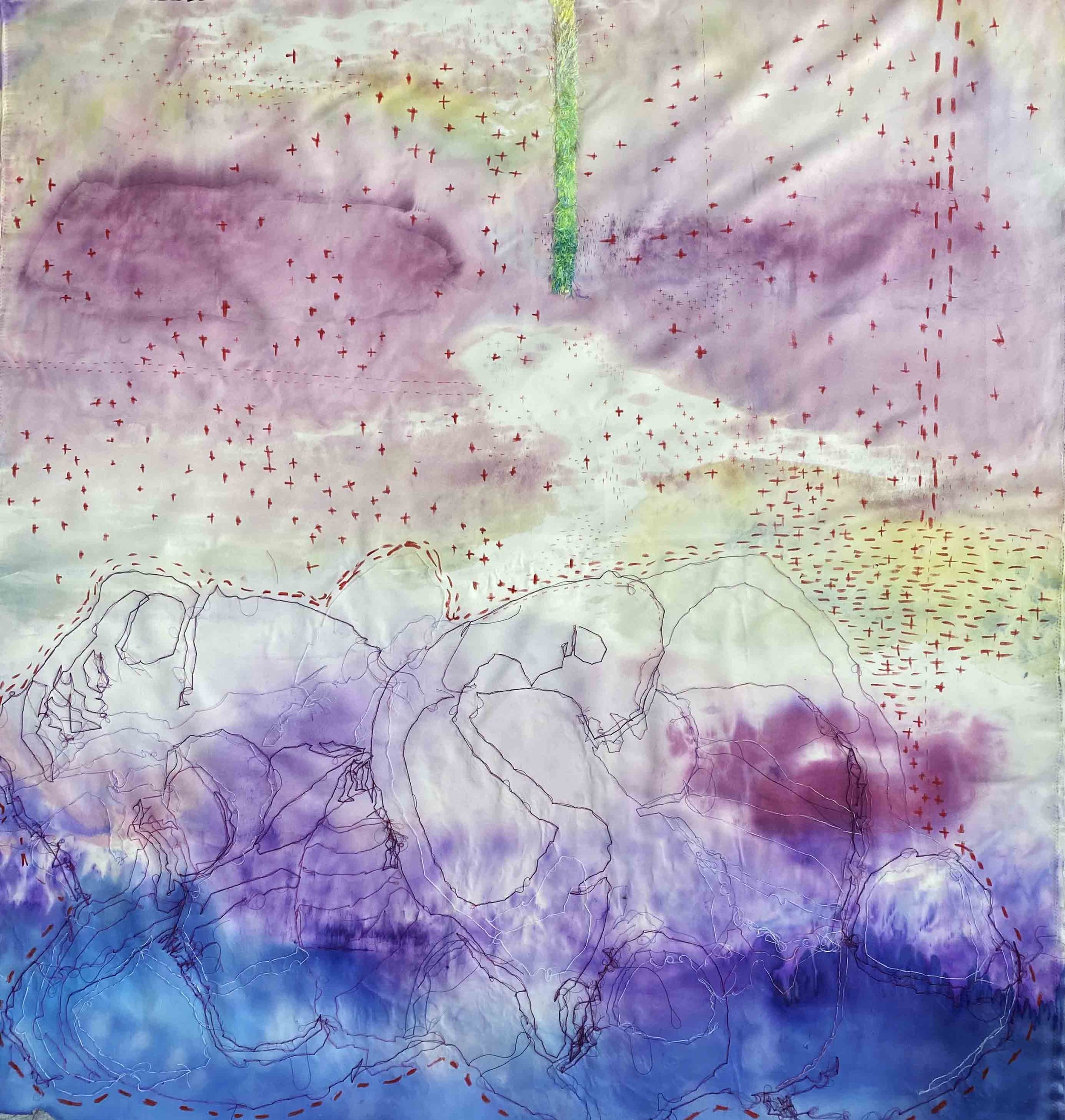 Nb7, 117x220cm, silk paint, acrylic, silk thread, oil on silk fabric