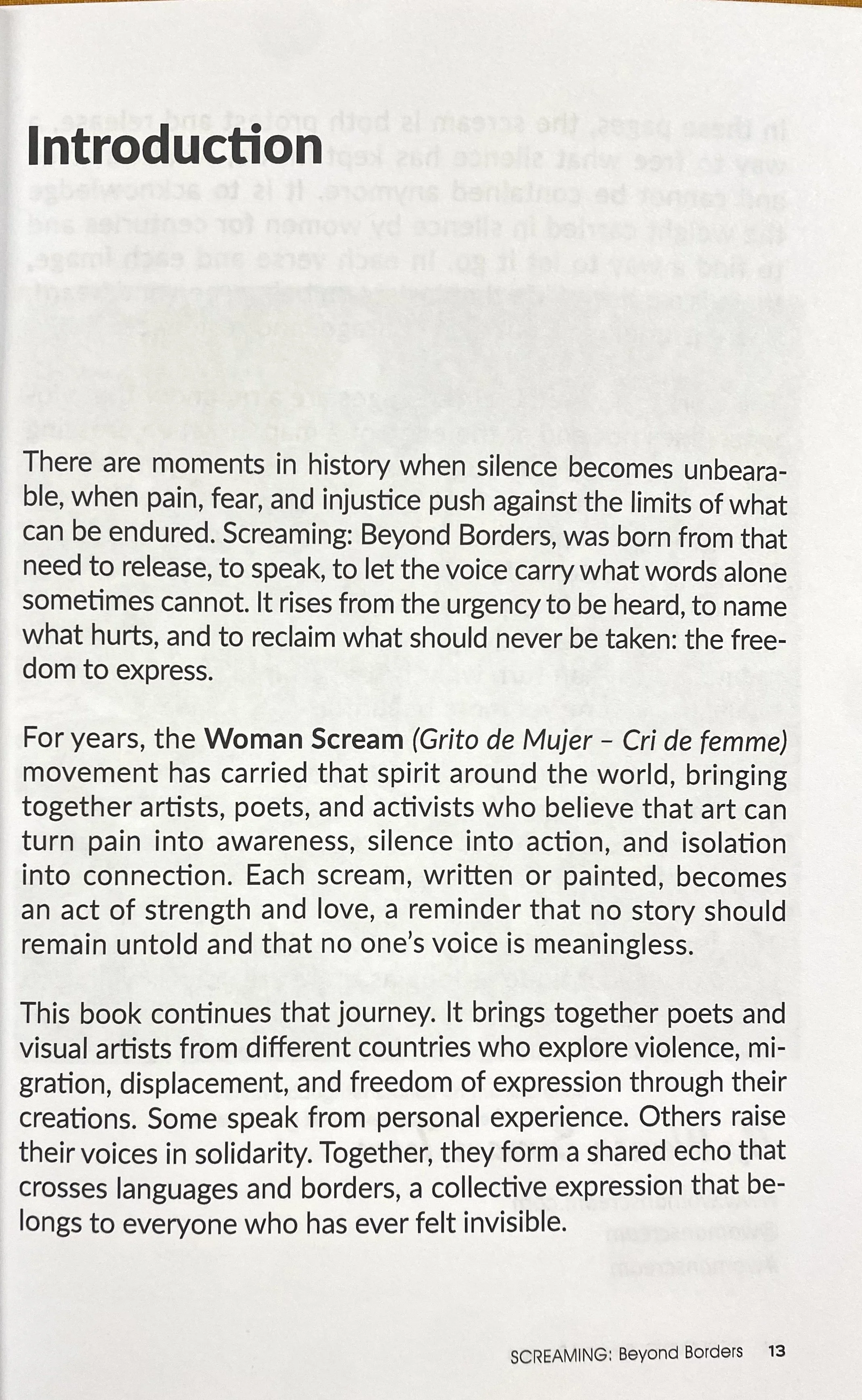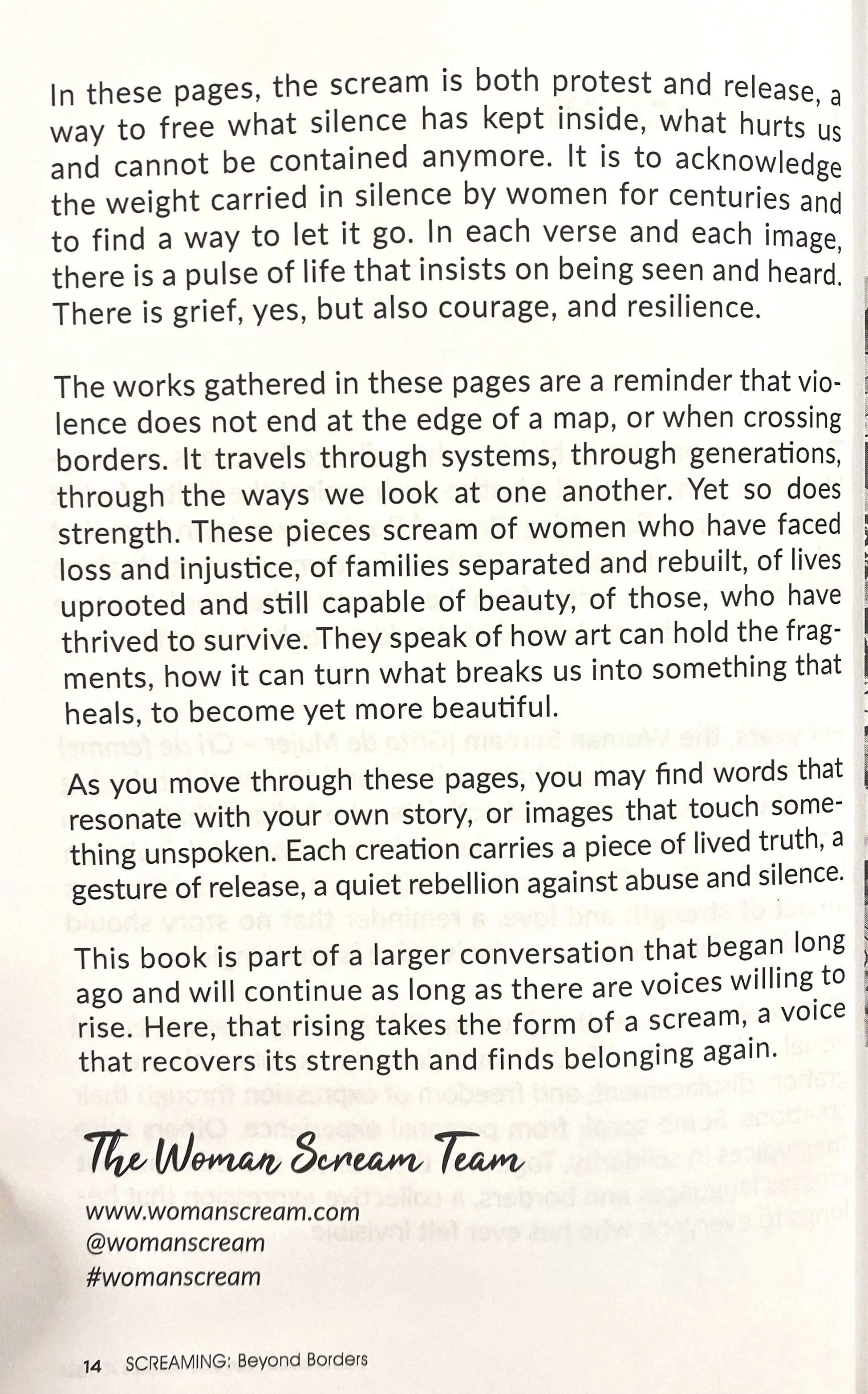 WOMEN SCREAM-the international anthology Screaming: Beyond Borders — a collective of writers and artists from around the world, created through the Woman Scream – Grito de Mujer movement, which started in the Dominican Republic